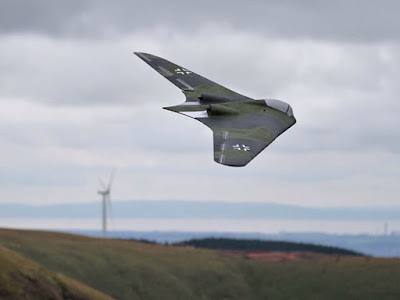By the afternoon we had 12 mph winds, which doesn't sound like a lot, but the lift produced on this slope is much more than you would see from other slopes. The electric powered models were put away and the pure gliders were batting along the slope nicely, and getting great lift in the booming thermals coming through. We even had a visit from a passing RAF SAR Sea King as it flew up through the Ogmore Valley.